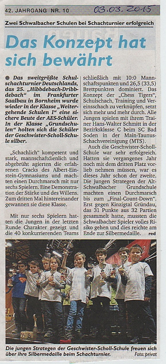 Schulschach Hibbdebach-Dribbdebach - Chess Tigers Schulschach-Teams erfolgreich ... Geschwister-Scholl-Schule Schwalbach gewinnt Silbermedaille - Anna-Schmidt-Schüler mit Plätzen 5, 10 und 21 bei 43 Teams - Phorms-Schule Frankfurt Platz 14 - Albert-Einstein-Schüler Schwalbach mit 4.Platz - alle Chess Tigers Teams mit über 50% Brettpunkte