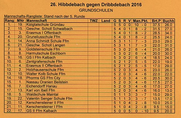 "Hibbdebach-Dribbdebach" - die Abschlusstabelle zeigt sehr genau, wo gute Jugendarbeit in Grundschulen gemacht wird, sowohl in Kinzigtal Gründau als auch bei Erasmus Offenbach wird eine Menge intern getan und bei der Geschwister-Scholl-Schule in Schwalbach (42 Schüler in 4 AGs), bei der Phorms-Schule in Frankfurt und Steinbach (48 Schüler in 5 AGs) und bei der Anna-Schmidt-Schule in Frankfurt (128 Schüler in 13 AGs) gestaltet das Chess Tigers Training Center den Schachunterricht und diese Schulen sind wahrscheinlich zu recht vorne in der Tabelle zu finden zum wiederholten Mal.