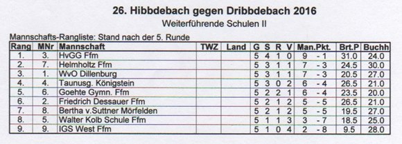 "Hibbdebach-Dribbdebach" - Das Albert-Einstein-Gymnasium aus Schwalbach musste mit 8:2 Punkten und 28,5 Brettpunkten das Gymnasium Oberursel, die Albert-Einstein-Schule Dreieich Langen und das Leibnitz-Gymnasium aus Offenbach in der 5.Runde noch vorbei lassen, weil die 3,5:4,5 Niederlage neben den zwei Mannschaften mit je 10:0 Mannschaftspunkten auch noch den Schlussrundengegner mit 8:2 Punkten und besserer Brettpunktzahl 31,5 den letzten Pokalplatz eroberte. Die Anna-Schmidt-Schule aus Niedererlenbach belegte mit 7:3 Mannschaftspunkten und 21 Brettpnkten den 10.Platz. Die Stadtschule Anna-Schmidt hatte zwar einen Brettpunkt mehr, aber nur 5:5 Team-Punkte und kam so in der Schlusstabelle nur auf den 21.Platz von 43 Teams.