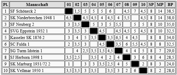 NORD - Noch enger ist die Situation in der Nordgruppe der Verbandsliga, wo der zukünftige Meister und Vizemeister nur einen halben Brettpunkt voneinander getrennt sind. Niederbrechen versäumte es in der der letzten Runde gegen Schlusslicht Vellmar groß abzuräumen, während Schöneck eben einen halben Punkt mehr herausspielte. Jetzt noch ein 8-0 gegen Idstein, und der Aufstieg ist perfekt. Wenn's denn immer so einfach wäre.