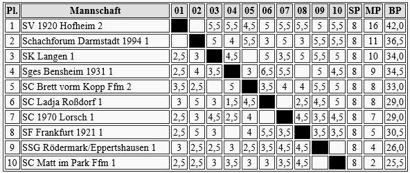 Gernsheim oder Frankfurt, einer dieser beiden wird praktisch Hessenmeister, experimental-theoretisch auch Dettingen, aber drei Wunder in einer Schlussrunde?! Frankfurt muss 2,5 Brettpunkte aufholen, das heißt, Gernsheim darf eigentlich nur knapp gewinnen, ausgerechnet gegen den Bezirksnachbarn aus Griesheim. Frankfurt hat gegen die Wertungsriesen aus Gelnhausen anzutreten, die bereits abgeschlagen auf einem möglichen Abstiegsplatz liegen.