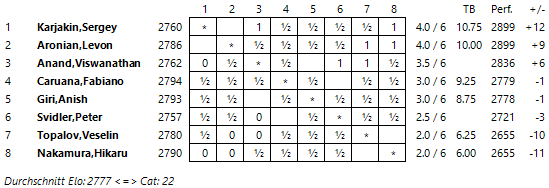 Mit einem ELO-Schnitt von 2778 wird die Turnierkategorie 22 erreicht.