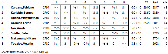 Mit einem ELO-Schnitt von 2778 wird die Turnierkategorie 22 erreicht.