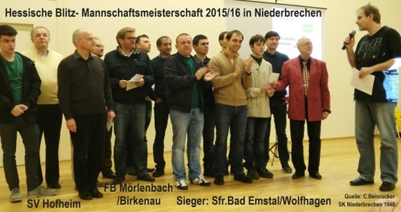 Bad Emstal/Wolfhagen wird in die Landesklasse aufsteigen, und auch die Kreisliga West wird man gewinnen. Nun also Hessischer Blitz- Mannschaftsmeister. Wie geht das? Nur mit einer guten Tagesform, und der Rest war schlecht drauf? Unterm Tisch in entscheidenden Spielsituationen mal getreten, Figuren umgeschmissen, oder die Uhr des Gegners vorgestellt? Mitnichten! Die Nordhessen, übrigens der erste Titel dieser Disziplin, der in diesen Bezirk wandert, brachten ihr Drohpotential fast komplett an die Bretter, nur der ehemalige Weltmeister Kramnik fehlte. Außerdem brachte man zwei starke Ersatzspieler mit und die absolvierten auch nicht wenige Spiele, so dass man ökonomisch vorging.
