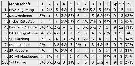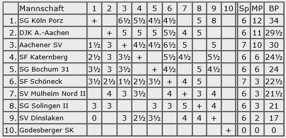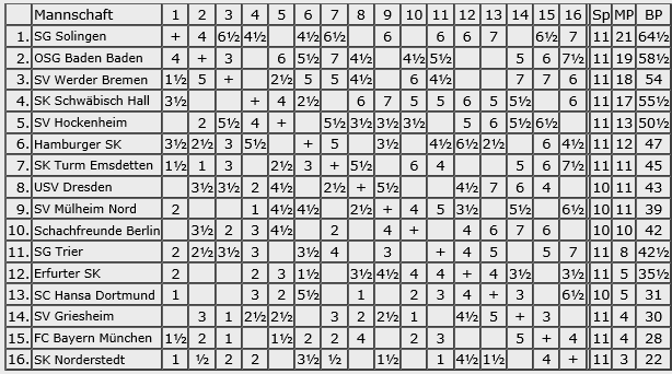 Die Schach-Chroniken bekennen sich dieses schweren Vergehens aber schuldig und bieten den interessierten Lesern schon seit Samstagabend, also noch am Turniertag, einen Blick in Einzel- und Mannschaftergebnisse, und natürlich auch eine Kreuztabelle. Ohne verstümmelte Vereinsnamen.