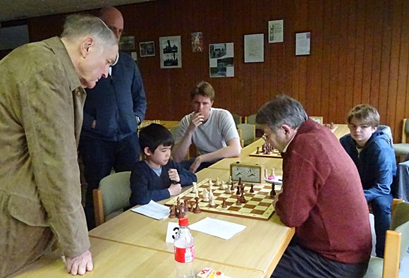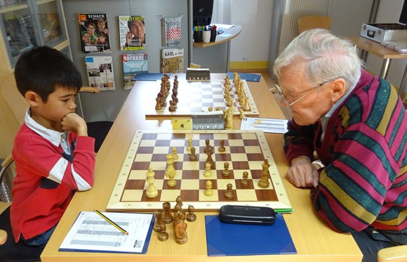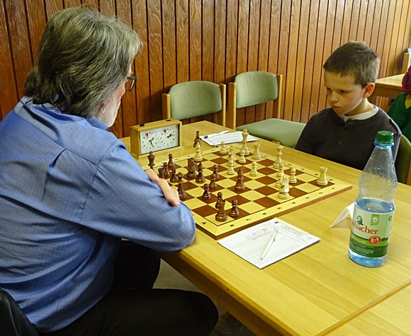 Brett 1: Hans-Walter Schmitt (DWZ 1917) vs Gregor Reichel (DWZ 1398) 1:0 Der Coach und Spielertrainer musste in der Partie schon 100% sicher gewinnen, um wenigstens den Anschlusstreffer zum 3:4 zu erzielen und dann konnte Miksa Ratfai versuchen in einem totremisen Bauernendspiel den erwachsenen Spieler noch auszutricksen - was ihm dann auch zum Entsetzen der eigenen Mannschaftskollegen gelang - also 4:4 am Schluss! Zum ersten Mal gelang damit ein Punktgewinn gegen eine komplette Erwachsenenmannschaft. Klasse gemacht von den Jungen.