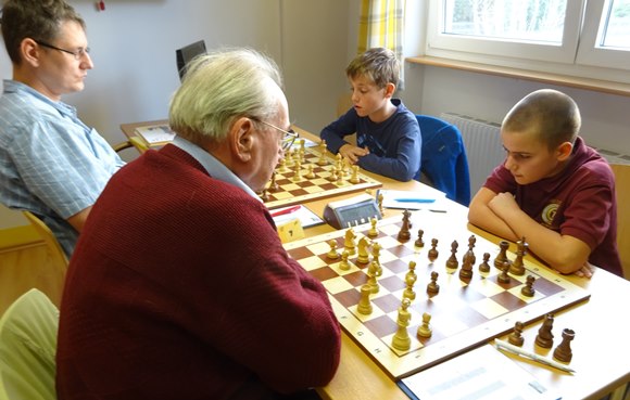 "Routiniert" Wenn wir die Mannschaft aus Steinbach schlagen können, würde der Abstand zu den zwei möglichen Absteigern sich auf 3 Mannschaftspunkte erhöhen und wir würden unserem selbst gesteckten Ziel "oben bleiben" einen wichtigen Schritt näher kommen. Leider fehlten wieder die Blagoev Brüder (wegen bulgarischer Sonntagsschule), die wir durch die jugendlichen Ansgar und Pawel ersetzen an Brett 7 und 8. Beide spielten richtig gut auf und Pawel gewann locker und Ansgar hatte ein wenig Pech, dass er die haushohe Gewinnstellung nach10 Zügen nicht verwerten konnte, am Schluss gab es ein totes Remis. Mit dem wiederum am 1.Brett eingsackten kampflosen Punkt hatten wir damit schon 2,5 Punkte. Daniel Senko am 2.Brett und Miksa am 5.Brett erhöhten auf 4,5 Punkte, ehe wir die erste Partie an Brett 4 mit Andreas gegen Jonas Glückmann verloren, dafür gewann aber postwendend an Brett 4 sein Bruder Christian souverän. Die letzte Paarung lautete Walter Giebitz gegen unseren jüngsten Spieler James Weller, der Schwarz hatte und zwischen dem 10-14.Zug mehr als ausgeglichen hatte und später der Routine (DWZ 1410) des erfahrenen Senior Giebitz Tribut zollen musste. Die Beschwerde des 8-jährigen Jungen kann man gut verstehen, weil er zu gern gewinnen würde, aber die "Alten" sind ein harter Prüfstein, um den vollen Punkt zu bekommen. Da aber unsere Jüngsten, James und Boyan, an Brett 3 und 4 aufgestellt sind, ist es nicht möglich sie nach hinten zu tauschen - das müssen auch die Eltern verstehen lernen. Am Schluss der Saison 2015/2016 als James wichtiger Sieg uns das 4:4 noch bescherte, war alles wieder vergessen.