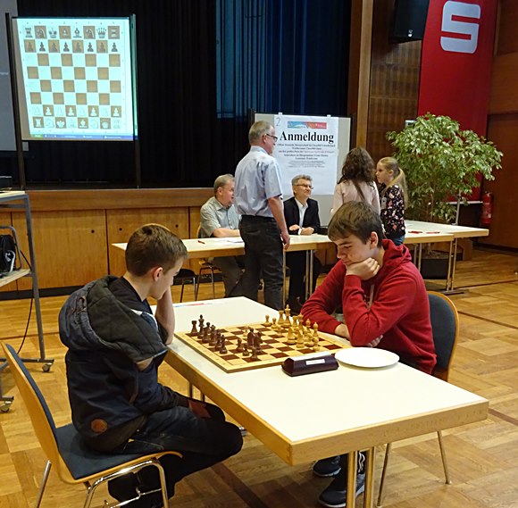 Die erste Runde läuft und Samuel Weber startet sehr gut, GM Artur Jussupow ist noch kalt und hatte Startschwierigkeiten, Hans-Walter Schmitt als 40igster der Meldeliste spielt am allerletzten Brett 40 ohne jegliche Probleme gegen die Nummer 80 der Setzliste Hoatian Zhang. Samuel Weber aus Flörsheim schlägt hier gerade Armin Jäschke (IPS 2181) vom SC Ostfildern