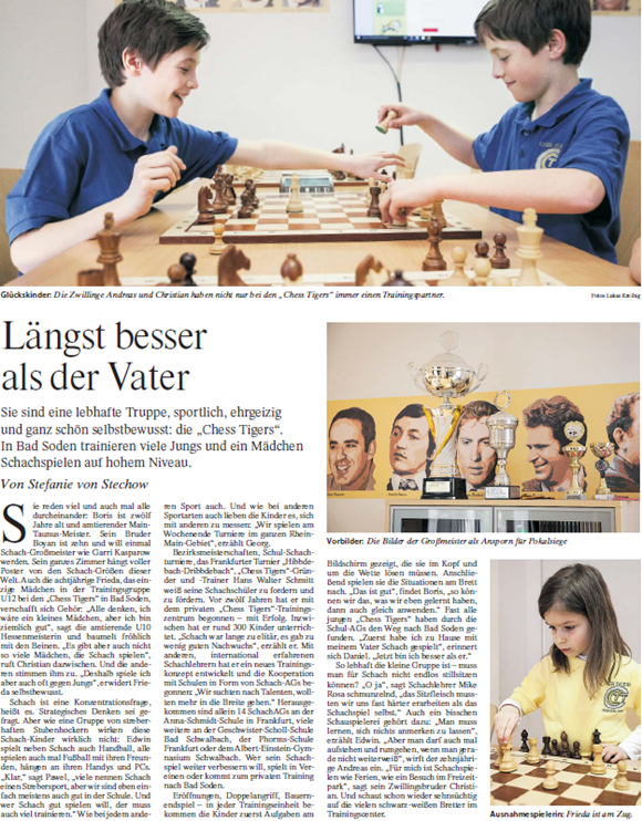 Im Mai diesen Jahres wurde die Sparte Kinder Leben der Frankfurter Allgemeinen Zeitung auf uns aufmerksam und traf sich mit uns im Chess Tigers Training Center zum Interview. Na ja, nicht ganz, denn an uns Trainern war man nur am Rande interessiert - die Kinder waren gefragt! Erstaunlich, wie professionell sich sowohl unsere Älteren wie auch die Jüngsten den "bohrenden" Fragen stellten und selbstbewusst ihre Standpunkte vertraten. Aber was war wohl letztlich das Wichtigste? Na klar, der gedruckte Artikel. Stolz und doch auch kritisch wurde dieser verschlungen: