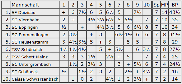 Hofheim tröstete sich, dass diesmal auch der zweite Platz zur Qualifikation für die Deutsche Meisterschaft reichte, da die Meister aus Nordhessen als Titelverteidiger automatisch vorqualifiziert sind. Und es wurden alle Brettwertungen gewonnen, Team und Einzel, oder zumindest geteilt. Bester Blitzer insgesamt war der Hofheimer FM Patrick Burkart, der an Brett 4 nur ein Remis abgab.