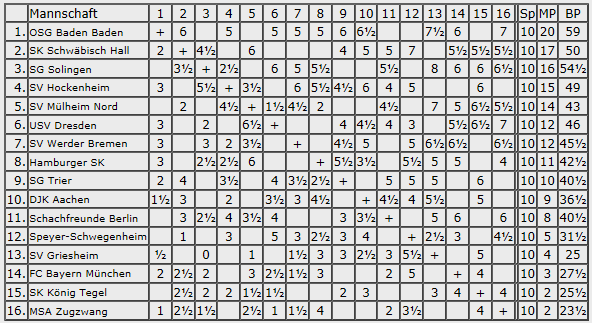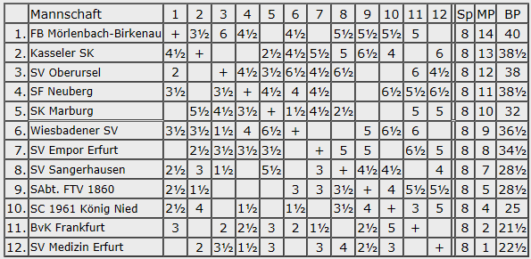 Die Karten um den Staffelsieg sind nun neu gemischt, da auch Oberursel gegen Wiesbaden ein hoher Sieg gelang, selbst Neuberg ist nach dem Sieg gegen Schlusslicht Erfurt noch im Kreis der Hoffenden aufgenommen worden.