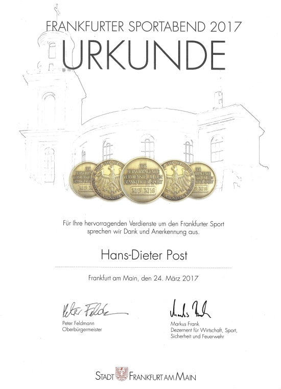 Nachrichten Ein Hoch auf unseren Post! Hans-Dieter Post von Stadt Frankfurt für herorragende Verdienste geehrt