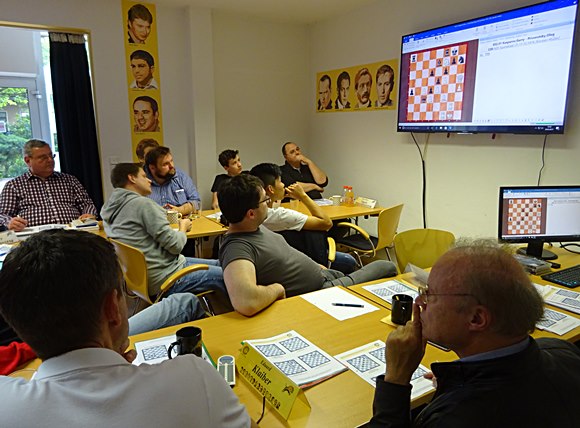 GM Dr. Karsten Müller in seinem ureigenen Element fühlt sich offensichtlich wohl unter der Beobachtung von Schachkapazitäten. Nicht nur sehr gut vorbereitet kann er auf profunde Theoriekenntnisse im Schach hinweisen, sondern auch auf eigene Erfahrungen und auf seine umfangreichen Erfahrungen bei der Ausbildung von jungen Schachspielern. Das genaue Studium der Weltmeister lässt ihn natürlich auch die zwischenmenschlichen Zusammenhänge der Schachgrößen der Vergangenheit bis in die Zukunft exakt wiederspiegeln. Großartig sind auch am Ende seiner Seminare, dass er hochaktuelle zum Thema passenden Preise seines Verlegers ChessBase dabei hat, die nach Anzahl der richtig beantworteten Aufgaben vergeben werden. Diesmal war die Bandbreite 18,0 bis 9,5 Punkte bei 24 gestellten kniffligen Fragen. Die Engine Komodo 11 war zum ersten Mal der finale Schiedsrichter bei Meinungsverschiedenheiten und beantragten "Zusatzpunkten".