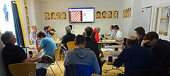 Der große Raum der "B9" war gut gefüllt und jeder hatte einen bequemen Sitzplatz mit Sicht zum Monitor, lediglich die zwei Tische mit den leckeren Snacks, Saisonobst: Erdbeeren in Hülle und Fülle und Kaffee bis zum Abwinken wurden angereichert mit Väths Johannis- und Apfelsaft - schmeckt fabelhaft. Dazu, daneben Schachbretter zum Blitzen und Probieren waren häufig und dicht eng umlagert und sehr gut kommentiert. Ja, diese mussten heuer in den Nebenraum, um die körperliche Ertüchtigung der Teilnehmer nicht zu vernachlässigen.