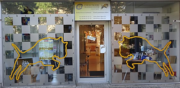 Von außen sieht man das Thema sofort: "Das Schach" und wer hinter dem Eingang residiert: "Die Tigers". Zusammengesetzt zeigt es die zielorientierte Gestaltung der Betreiber: "Die Chess Tigers Familie"!