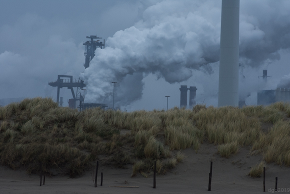 Ein Blick in die andere Richtung. Hinter den Dünen bestimmt der große Stahlkoloss. TATA Steel die Skyline.