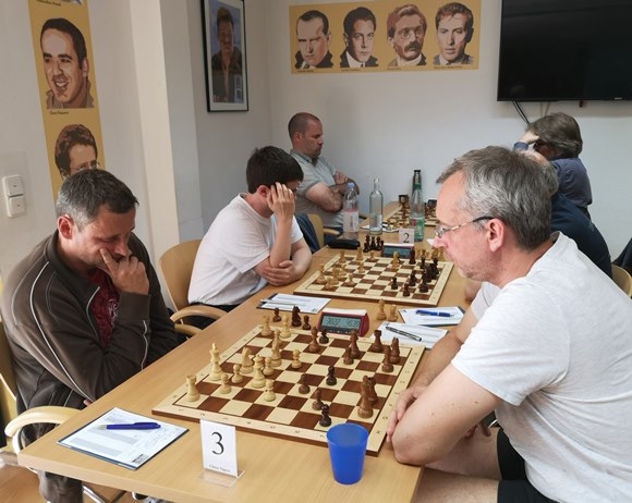 Dr. Radu-Liviu Munteano hatte das stärkste Nervenkostüm und hielt stand in dieser einzigartigen Zeitnotschlacht bei falsch eingestellter Uhr, die in der zweiten Periode, ab dem 40.Zug keine 30 Sekunden Zeitgutschrift mehr hinzu addierte und plötzlich war die Klappe des Gegners unten. Protest hin, Protest her, Blättchenfall ist Blättchenfall, die defekte Uhr ist schuld, oder der Veranstalter, es wurde ein bisschen hektisch, jeder baute seine Argumentenmauer auf, die dann wieder abgebaut wurde bei Vernunft und Fairplay. Telefonkonferenzen und Anreise des Ligaleiters Frank Staiger musste erfolgen. Es musste weitergespielt werden nach Kondolenz des Ligaleiters, aber wir hatten die Gewinnstellung!! Mit 12min 30s bei Schwarz und 12min 49s bei Weiß (Radu) wurde weiter gespielt und Radu ließ nichts, aber auch gar nichts mehr anbrennen. Mittlerweile hatte Thomas, zusätzlich in Funktion des Schiedsrichters betraut, auch sein Springerendspiel mit Bauernplus auf der achtspurigen Gewinnspur, wobei der Gegner nur noch die Uhr laufen ließ und nach Zeit verlor! Der SC Bad Soden hatte das Ding noch grandios geschaukelt, ab jetzt zum Apres Chess!