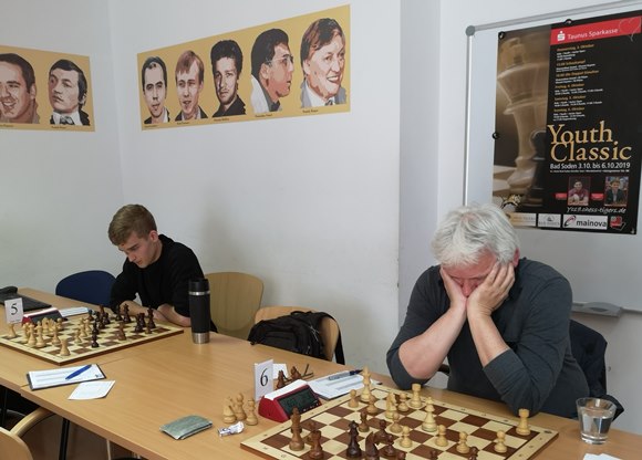 28.05.2019 - We are Europe! Wahlhelferverpflichtung, Auslandsreise Bulgarien und Tennis-Medenspiele dezimierten das Team des SC Bad Soden 1 nicht stark genug, um chancenlos ins entscheidende Relegationsspiel gegen den Verbandsligisten Marburg 2 zu gehen. Mit den Ersatzleuten Thomas Rödiger (Team 2), Hans-Walter Schmitt (Team 5) und Robert Ackermann (Team 2) wurde in der "B9" im Traning Center der Chess Tigers der Kampf an- und aufgenommen. Die Stammspieler Stefan Erdmann, Dr. Radu-Liviu Munteanu, Ulf Schlanke, Kevin Haack und Leo Max Deppe sollten genug Kampfgeist und Erfahrung mitbringen, um das "Kind" schon zu schaukeln. Dass wieder einmal der Spruch herhalten musste, dass "Ein gutes Pferd nur so hoch springt, wie es muss" grenzt nach dem knappen Aufstieg von Team 5 in der Saison 2018/19 ein bisschen an Legendenbildung! Ja, es war ein erfolgreicher Ritt auf der Rasierklinge, nachdem an Brett 7 - Hans-Walter - mit einem groben Figureneinsteller im 17.Zug in Gewinnstellung (+1,8) die Partie nach gut eineinhalber Stunde schon aufgeben musste! Shit happens!