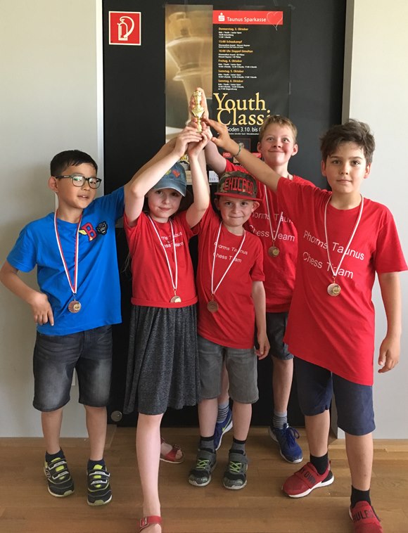 02.06.2019 - Ein wahres dramatischen Ringen setzte in den letzten zwei Runden im Kampf um die Tabellenplätze ein. Von den 13 Teams der Grundschule waren Weißkirchen, Eichwäldchen und Phorms Taunus die stärksten Teams. Weißkirchen führte in den ersten fünf Runden, nachdem es in Runde 3 das Chess Tigers Team von Phorms Taunus besiegt hatte, Weißkirchen verlor jedoch in der vorletzten Runde, sodass Phorms ausgleichen konnte. Vor der letzten Runde hatten beide Teams 10:2 Mannschaftspunkte, aber Phorms führte nach Brettpunkten. Mit einem souveränen 4:0 Sieg gewann das Chess Tigers Phorms Team durch die beste Zweitwertung (1,5 Brettpunkte mehr). Pascal Neininger mit 7 Punkten aus 7 Partien und Philipp Bernzott mit 5/5 gewannen auch die Preise für die besten Leistungen an den Brettern 2 und 3. Ein Mannschaftsergebnis mit 23 Punkten aus 28 Partien mit zwei 100%er, das heißt schon was! Die Einzelergebnisse waren: