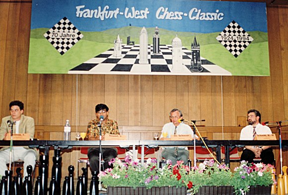 Hans-Walter Schmitt, unser damalige Präsident des Schachclub Frankfurt-West e. V. und heutige Ehrenpräsident hatte Großmeister Viswanathan Anand überzeugt bei der Chess Classic zu spielen (siehe Bild). Viswanathan Anand spielte am Eröffnungstag an 40 Brettern simultan und hatte nach 4:22 Stunden gegen starke Gegner nur einen Punkt und 5 Remis abgegeben. In den folgenden Jahren war er regelmäßiger Gast bei der Chess Classic und sammelte dort Siege am laufenden Band. In seinem Eintrittsjahr war Viswanathan Anand auf Platz 4 der jeweiligen Weltrangliste (FIDE und PCA).