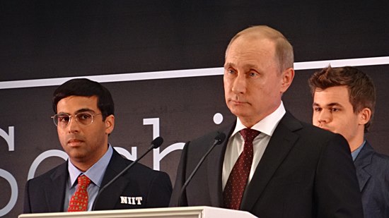 Der Präsident Russlands und einer der mächtigsten Männer der Welt, Vladimir Vladomirovich Putin, bei der Siegerehrung der Weltmeisterschaft zwischen dem Norweger Magnus Carlsen und dem Inder Viswanathan Anand im Schach, eines der anspruchvollsten Spiele der Welt. Vielleicht erinnert sich ja der russische Zar Putin, warum das Schach von einem "weisen" Mann aus Indien oder Persien erfunden wurde!