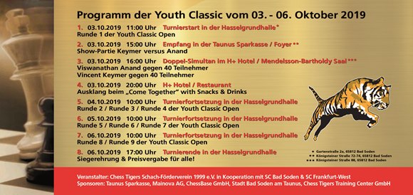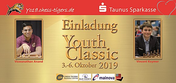 01.10.2019 - Wer hätte Mitte März 2019 daran gedacht, dass den Chess Tigers die konsequente Weiterentwicklung der Youth Classic im sechsten Jahr so wirkungsvoll gelingt. Mit seinen Partnern in der Region und seinen großartigen Mitgliedern, besonders Viswanathan Anand und Vincent Keymer gings weiter aufwärts. An der Stätte des einmaligen historischen Events im Jahre 2000 der "Premiere der Top Ten" im großen Mendelsson-Bartoldy-Saal des Treff-Parkhotels, laden wir die Jugend der Region Rhein-Main-Taunus zum Schach ins schöne Bad Soden am Taunus ein. Die Kids-, Youth- und Junior-Open finden in der geräumigen Hasselgrund-Halle statt. "Am Tag der deutschen Einheit" gibt es dann nach der 1.Runde in der Filiale der Taunus-Sparkasse den Showkampf zwischen Viswanathan Anand (Elo 2765) / Hans-Walter Schmitt (Elo 2071) gegen Vincent Keymer (Elo 2506) / Prof. Dr. Ralph Neininger (Elo 2119). Anschließend begegnen dann im heutigen H+ Hotel jeweils 40 Teilnehmer dem vielfachen Weltmeister Viswanathan Anand und dem aufstrebenden Hoffnungsträger in Deutschland, Vincent Keymer aus Saulheim nahe Mainz gelegen. Die Begegnungen von Weltklassespielern im Schach mit der ganz normalen Gesellschaft war seit jeher die selbstgestellte Herausforderung der Chess Tigers seit gut 25 Jahren - das benennt man im Privaten eine "silberne Hochzeit." Wir möchten Ihnen jetzt die kleine Entstehungsgeschichte der Youth Classic 2019 in Bildern und Worten dokumentieren und einige nahe gelegene Partner unserer Schachaktivitäten bildlich zeigen.