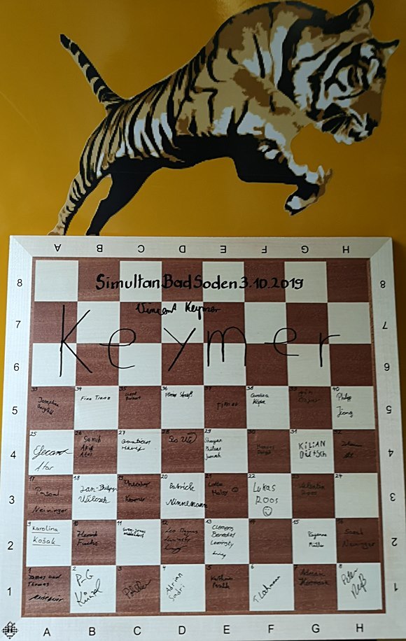 "Ein historisches Schachbrett, bei dem nicht alle unterschrieben haben, entweder vergessen oder Datenschutz, wer sich noch verewigen möchte, hat die Gelegenheit im Chess Tigers Training Center. Brett 14 (Andres Haller, SC Bad Soden) und Brett 24 (Julian Lindl, SF Neureuth) könnten Ihre Unterschrift noch gerne leisten.