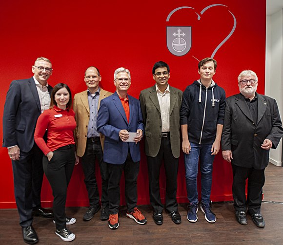 Nach der Tandem-Partie wurde noch ein Bild von den Beteiligten gemacht: v.l.n.r.: Mitglied des Vorstandes der Taunus Sparkasse Markus Franz, Vorstandsassistenz Daniela Martin, Vorsitzender der Chess Tigers Prof. Dr. Ralph Neininger, Filialdirektor & Gastgeber Peter Krissel, Weltmeister Viswanathan Anand, Großmeister Vincent Keymer und Veranstalter der Chess Tigers, Hans-Walter Schmitt.