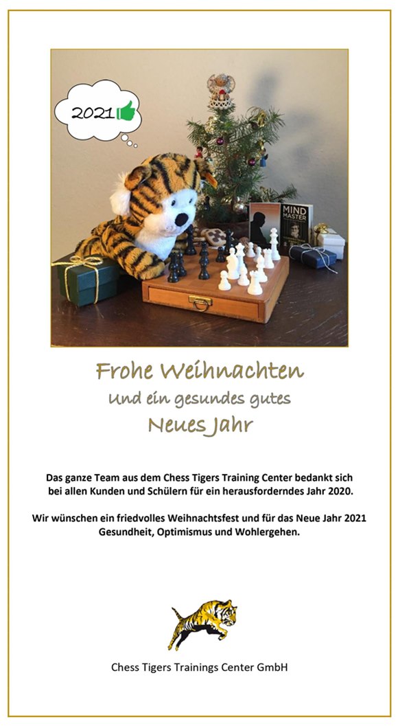 Frohe Weihnachten 2020 & Gesundes Neues Jahr 2021Die Chess Tigers Training Center GmbH und der Chess Tigers Schach-Förderverein 1999 e.V. wünschen alles erdenklich Gute.
