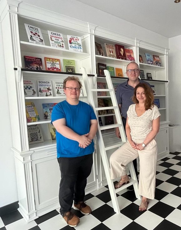 20.09.2023 - Schlüsselübergabe im Hauptstadt-Schachladen. Vergangenen Samstag fand die offizielle Neueröffnung des „Schachladen Lasker´s – Chess Tigers Store“ in Berlin statt. Voreigentümer Arno Nickel hatte die Freude die erste Rede zu halten und richtete dabei seine Worte insbesondere an das Team der Neueigentümer Marina und Sven Noppes sowie Jonathan Carlstedt. Anschließend übernahm Sven Noppes das Wort und berichtete den zahlreichen Anwesenden, wie am 4. März 2022 in einem Bremer Café das Schicksal seinen Lauf nahm, als er sich eigentlich nur auf einen freundschaftlichen Kaffee mit Jonathan Carlstedt treffen wollte. Geboren wurde an diesem Tag die Idee etwas Gemeinsames auf die Beine zu stellen. Wenige Tage später übernahm das Team das SchachDepot aus Stuttgart. Damals nur noch eine Internetadresse mit ein paar Hundert Büchern. Seitdem bauen die drei das Geschäft aus. Zum Jahresende 2022 kam auf Initiative von Hans-Walter Schmitt die Chess Tigers Training Center GmbH aus Bad Soden am Taunus nahe Frankfurt am Main gelegen in die Gruppe hinzu und unlängst am 16. September 2023 offiziell der Schachladen in der Sophie-Charlotten-Straße 28.