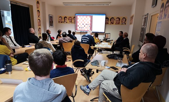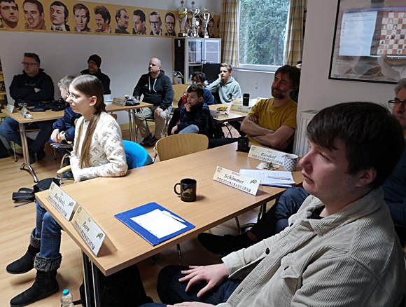 Wie immer war GM Michael Prusikin glänzend vorbereitet und nahm sich auch Zeit für die jugendlichen 7 Teilnehmer und besonders für die freundlichen 14-jährigen Zwillingen Tymur und Platon aus der Ukraine, die demnächst für unseren Mitgliedsverein Wiesbaden SK 1885 spielen werden. Kurios war, dass sie bisher nur am Bildschirm Schach gelernt hatten und nunmehr im Training Center der Chess Tigers auf Holzbrettern mit Holzfiguren und DGT-Schachuhren eine Premiere erleben durften. Ihre Spielstärke wurde jetzt schon von Experten auf 1900 bis 2100 DWZ geschätzt. Nicht schlecht die Beiden!