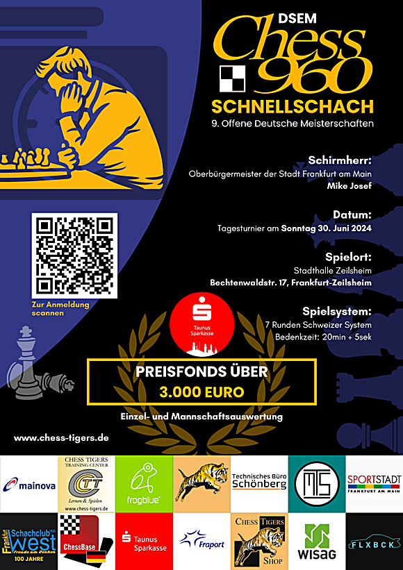 Die Öffentlichkeitsarbeit wird unterstützt: Beide Plakate für die Youth Classic 2024 und die 9.Offene Int. Deutsche Schnell-Schach Meisterschaft im Chess960 2024 mit den 4-Falt-Flyer können genutzt werden.