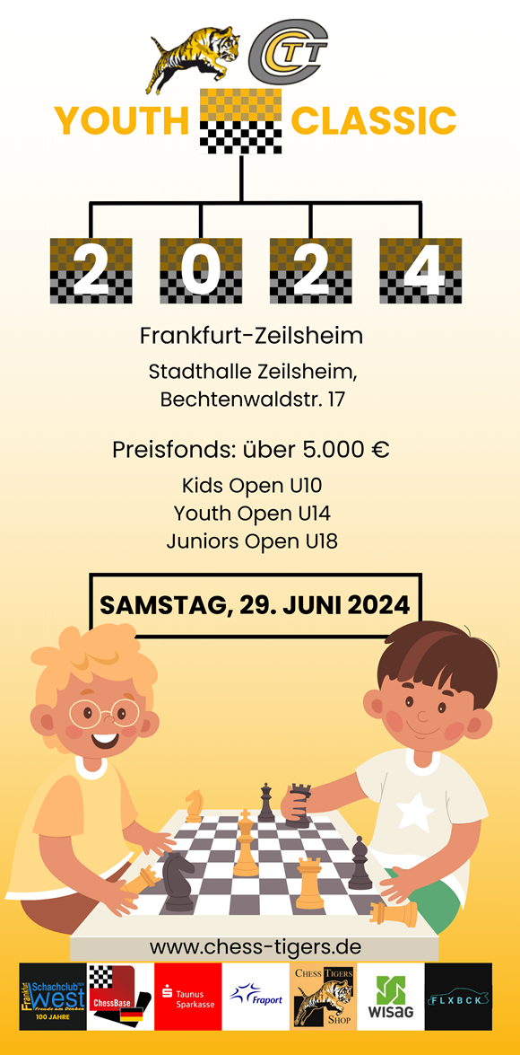 15.06.2024 - Die Startplätze in den bekannten Jugendklassen U10, U14 und U18 sind sehr begehrt und bereits heute auf Rekordniveau. Die intensive Schachwerbung in den bekannten Schulen mit Schach-AGs scheint in der Rhein-Main-Taunus-Region Früchte zu tragen und ist der wohl effektivste Einstieg in das Schachleben einer jungen Spielerin und jungen Spielers. Der Weg von der Schach-AG in der Schule zu den bekannten und Jugend orientierten Vereinen ist vorgezeichnet. Deutlich wird das mit dem Verhältnis Verein und Schule und besonders im U10-Kids Open im Verein von DWZ (Deutsche Wertungszahl)-Inhaber und derer ohne DWZ. Wir sind bereit alle bis zu 256 Sitzplätze umfassenden Kapazitäten in der großen Saalbau Stadthalle Frankfurt-Zeilsheim auszunutzen, sind aber jetzt schon deutlich über Rekordniveau. Fordern Sie uns heraus, fördern Sie uns maximal mit noch reichlichen Anmeldungen in den letzten zwei Wochen bis zum Samstag, den 29.Juni 2024 9:30 Uhr. Hier in Zeilsheim begann alles für den SC Frankfurt-West am 8.-10.Juli mit dem 1.ORDIX Open und zwei Simultans mit unserem Ehrenmitglied und Schachweltmeister Viswanathan Anand mit der 1.Frankfurt-West Chess Classic ´94`!!