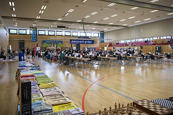 Blick vom großen Chess Tigers Stand in den geräumigen Turniersaal in dem Saalbau Frankfurt-Zeilsheim ...
