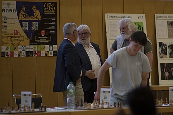 04.07.2024 - Zum 100-jährigen Bestehen des Schachclub Frankfurt-West, gegründet im Jahre 1924 und hervorgegangen durch die Vermählung der Vereine SK Unterliederbach und SC Sindlingen 1989. Das Ehepaar kuschelte sich mehr und mehr zu einem aktiven Schachmittelpunkt im Frankfurter Westen und gebar nach 5 Jahren Probezeit ein süßes "Baby" mit dem Namen Chess Classic. Mit "Go West" wurde dann die schöne und schnelle Tochter 1994 bis 1999 zur Schulreife erzogen. Als die Grundschulreife erreicht wurde im Jahre 2000 musste umgezogen werden nach Mainz. Das stark athletisch und mit praktischer Intelligenz geprägte Wesen besaß so eine Art Hochbegabung und entwickelte sich zur glücklichsten Schülerin in Mainz am schönen Rhein. Genau in 17 Jahren erreichte das "Baby" mit dem G8-Abschluß und einem 1,0er-Abitur in der Tasche die Qualifikation in der freien Welt mit modernen Schachideen zu überleben. Das Zusammenspiel mit den herausfordernden Aufgaben an ein perfektes Schach-Ausbildungssystem, in dem Schule und Vereine Partnerschaften auf "immer" eingingen war genauso gewinnversprechend, wie der Einsatz der stets wachsenden künstlichen Intelligenz. Sich in Zukunft natürlich am Brett zu begegnen und ein paar Stunden ohne den Einsatz von KI-Werkzeugen sich gegenüber zu sitzen, wird sicher befriedigende Herausforderung bringen und zu unbezahlbarem Luxus in der Schachwelt werden. "Gewinnen fängt immer an mit Beginnen". Hier im Frankfurter-Westen sollte wieder ein Anfang gemacht werden mit Menschlichkeit, Natürlichkeit und Schachgenuss pur für Groß und Klein, usw.. Aber jetzt zu den jungen Schachspielern, die ihre Besten spielend suchten!