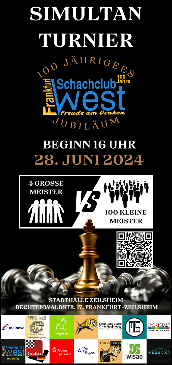 15.07.2024 - Zum 100-jährigen Bestehen der Vereine SK Unterliederbach gegründet am 09.05.24 im "Deutschen Haus" und dem SC Sindlingen gegründet 26.09.1925 im Gasthaus "Taunus" wurden am 27.01.1989 in der Fusionsversammlung beide Clubs vereinigt zum Schachclub Frankfurt-West e.V. Diese Fusion war nicht nur begründet mit der freundschaftlichen Verbundenheit über viele Jahrzehnte, sondern auch durch die Notwendigkeit, die sportlichen und personellen Ressourcen zusammen zu legen, um dann gemeinsam einen modernen und attraktiven Verein im Frankfurter Westen zu gestalten. In den Jahren 1994 bis 2000 wurde mit der Turnierserie Frankfurt Chess Classic einer der weltweit bedeutendsten und attraktivsten Schnell-Schach-Treffen auf dem Globus etabliert. Mit dem ersten Erscheinen 1998 von WM Garry Kasparow waren wir dann weltweit auf dem Radarschirm deutlich sichtbar neben Dortmund, Wijk aan Zee und Linares. Mit den Top Four 1998 Kasparov, Anand, Kramnik und Ivanchuk verweigerte Karpow noch die Teilnahme, aber 1999 konnten wir ihn dann knacken, besser gesagt zwingen, mitzuspielen, vier Weltmeister (amtierende und spätere) hoben in der Ballsporthalle zwischen Unterliederbach und Zeilsheim gelegen die Schachwelt in die höchsten Höhen. Das Nonplusultra seinerseits brachte samstags 1391 zahlende Zuschauer (14 DM) und 13min Schach im aktuellen Sportstudio, bei dem es sogar unser Ehrenmitglied Viswanathan Anand gelang den Boxweltmeister Vitaly Klitschko an der Torwand mit 1:0 zu besiegen. Aber dies war schon ein so unglaublicher Höhepunkt, der im Folgejahr 2000 aber noch mit dem Top 10 Begegnungen Mensch & Computer Fritz on Primergy übertroffen wurde. Zum ersten Mal gelang uns Westler dieses organisatorische Kunststück seit die Turniergeschichte im Schach im Jahre 1851 begann. Und jetzt sind wir wieder in dieser Frankfurt-Zeilsheimer Stadthalle und feiern unseren 100.Geburtstag mit 100 Brettern "Meister gegen Amateure und Schüler" aus der ganzen Umgebung. 471 Spielerinnen und Spieler - das kann sich doch sehen lassen als Neustart, oder?
