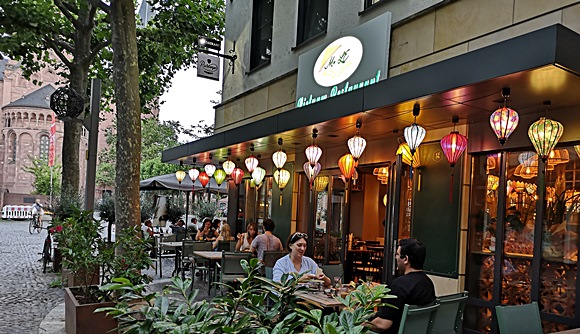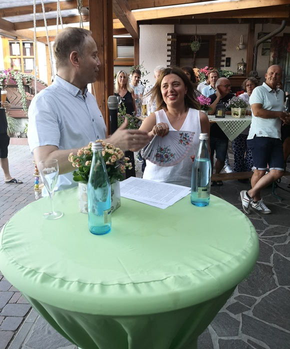 Hartmut und Thea Metz sind seit langem ein quicklebendiges und umtriebiges Paar, bei dem wir uns alle wie zu Hause fühlten. Die Lokation war prädestiniert für solche Veranstaltungen: halb im Freien, halb im Innern, genauso, wie es einem gut tat, beschirmt oder unbeschirmt in kurzen oder langen Hosen. Essen und Trinken, alles was das Herz begehrt in dieser gastwirtschaftlichen Serviceoase. Danke mein Lieber.