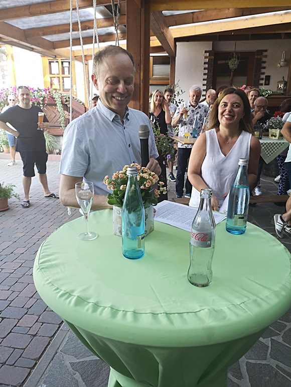 Eine sehr launige Rede ließ Hartmut zu seiner Deutsch-Georgisch Freundschaft und Verwandtschaft folgen und dankte seiner Frau Thea herzlich dafür, dass es ihm wieder gut geht und er auch das Pet Shop Boys Konzert in der SAP-Arena in Mannheim am 30.Juni 2024 besuchen konnte. Ein total schönes und beschwingtes Zusammentreffen seiner gut 130-150 Freunde, die er beim Schach, beim Tischtennis und beim Badischen Tagblatt später vorstellen ließ.