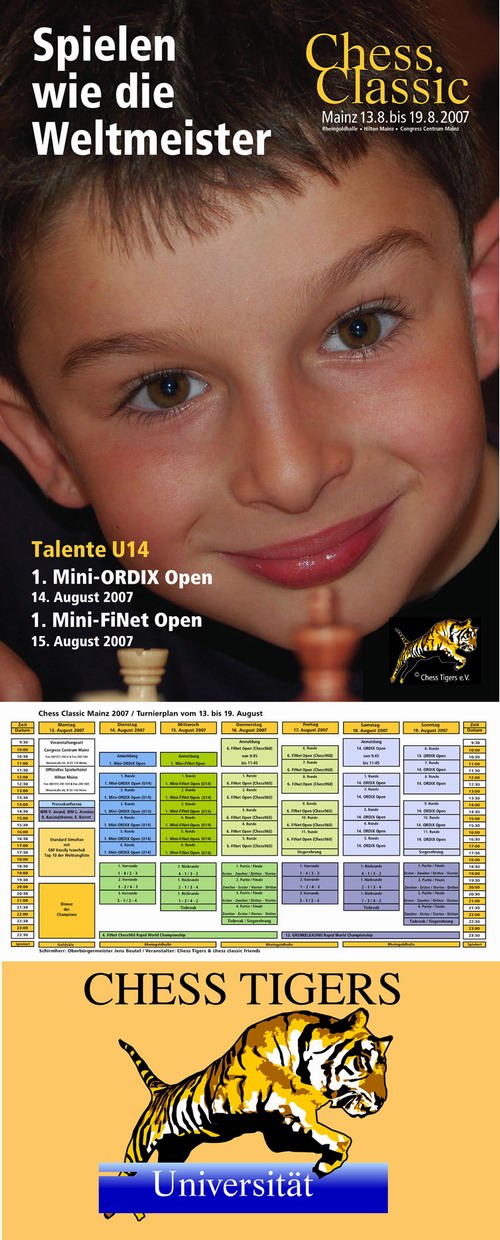 Nach dem Training kommt das Spielen! Diese Grundregel kennt natürlich auch Deutschlands Schachtrainer Nr. 1, Artur Jussupow, und da die Chess Tigers es zudem als ihre Pflicht ansehen, nicht nur das Spitzenschach sondern auch das Jugendschach zu fördern, haben sie in diesem Jahr in Zusammenarbeit mit ihrem Chef-Trainer erstmals die neuen Talentturniere U14 in das Programm der Chess Classic integriert. Am Dienstag (14.08.) dürfen die Kids im 1. Mini-ORDIX Open noch ihre Theoriekenntnisse im traditionellen Schach nutzen, doch am Mittwoch (15.08.) werden sie uns dann im 1. Mini-FiNet Open zeigen, wie kreativ sie im Chess960 sind. "Spielen wie die Weltmeister", heißt das Motto, was damit umgesetzt wird, dass die Spitzenbretter des Nachwuchses jeweils auf der großen Bühne der Rheingoldhalle platziert sein werden und natürlich sowohl erfasst als auch live übertragen werden. Da möchte man fast selbst noch mal unter 14 sein... Artur Jussupow persönlich wird sowohl den Weltmeistern von morgen als auch deren Eltern während der Turniere als Ansprechpartner und Berater zur Seite stehen und versuchen, nützliche Tipps zum weiteren Training mit auf den Weg zu geben. Dieses Konzept von Spielen und Lernen unter Weltklassebedingungen ist absolut neu und macht alleine die Chess Classic Mainz erneut zu einem der Highlights im Schachkalender 2007.
