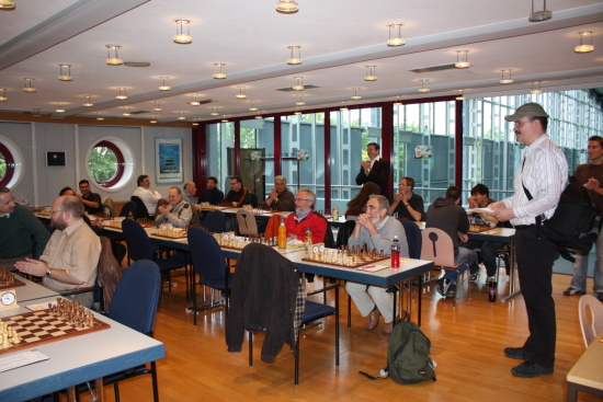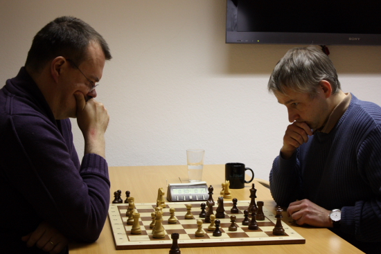 Hans-Dieter Post gegen Hausherr IM Erik Zude bei der 1. B9 Chess960 Rally im Chess Tigers Training Center