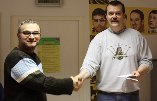 Ab und an darf der Turnierleiter auch seinem Interviewer einen Preis überreichen, wie hier bei der 1. Frankfurter Chess960 Stadtmeisterschaft 2010