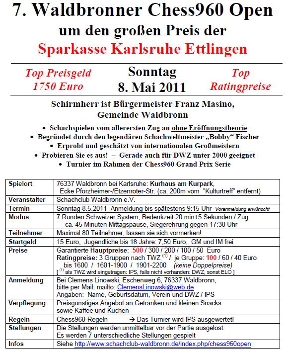 30.03.2011 - "... weil Schachspielen bei uns Spaß macht", kann man auf der Homepage des Schachclub Waldbronn lesen, und dieses Argument lässt sich auch bestens für das Waldbronner Chess960 Open anführen. Am 08. Mai ist es wieder soweit, im Kurhaus am Kurpark im Herzen des malerischen Waldbronns wird zum bereits siebten Mal ein Schnellturnier in dem einst von Bobby Fischer erdachten Chess960 ausgetragen. Zusammen mit der Sparkasse Ettlingen und stets mit dem amtierenden Bürgermeister als Schirmherr hat sich dieses Turnier einen festen Platz im Schachkalender derer gesichert, die gerne auch mal die gepaukte Theorie daheim lassen. Für ein Tagesturnier im Chess960 ist ein Preisfonds von 1.750,- Euro mehr als beachtlich. Davon gehen allein satte 500,- Euro an den Sieger, was garantiert auch wieder den einen oder anderen Meisterspieler anlocken wird.