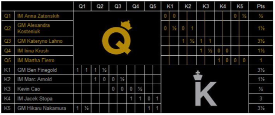 12.09.2011 - Zur Eröffnung der World Chess Hall of Fame in Saint Louis haben sich die Verantwortlichen mächtig ins Zeug gelegt. Eine große Eröffnungsparty mit zahlreichen Gästen aus der ganzen Welt machte den Anfang und wird in diesen Tagen von einem besonderen Turnier wortwörtlich gekrönt. Denn es treten fünf "Kings" gegen fünf "Queens" sowohl im traditionellen Schnellschach als auch im modernen Chess960 an. Nach zwei von fünf Runden haben die Männer mit 12:8 die Nase vorn. Beide Teams weisen einen ELO-Schnitt von fast 2480 auf. Live per Video kommentiert wird das Geschehen auf und neben den Brettern von GM Yasser Seirawan und WGM Jennifer Shahade in der gewohnt lockeren und unterhaltsamen Weise, wie es die Amerikaner (und nicht nur die) nunmal lieben. Mittendrin ist auch Chess Tiger Eric van Reem mit seiner Kamera und präsentiert in der Folge ein paar exklusive Bilder, welche wir noch mit einigen Screenshots der Videoübertragungen ergänzt haben. Täglicher Rundenstart ist übrigens um 22:00 Uhr unserer Zeit. Erst folgt eine Runde Chess960, dann normales Schnellschach.