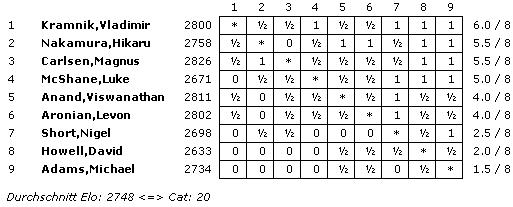 Mit einem ELO-Schnitt von 2748 wurde die Turnierkategorie 20 erreicht.