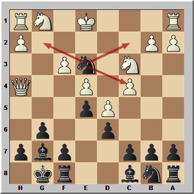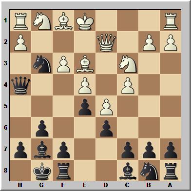 In dieser Stellung spielte Schwarz 11...Sxc3!? und opferte so seine Dame. Zwar stellte sich nach weiter 12.Lxd8 Sxd1 13.Lxc7 Lxc7 14.Sxc6 Se3 15.Lb5! heraus, dass Weiß (klar) besser steht, doch am Brett hatte der Anziehende in der Folge noch viele Probleme zu lösen.