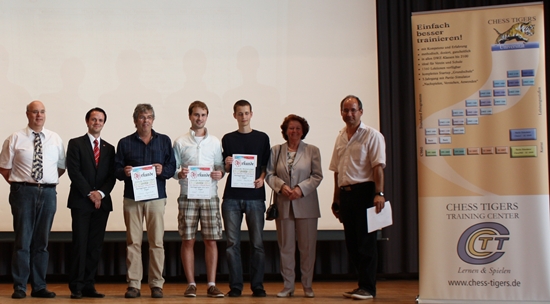 24.06.2012 - Ganz genau eine Woche ist es her, da veranstaltete der Schachclub Waldbronn das 8. Waldbronner Chess960 Open und hatte es zuvor kurzerhand gleich mal als 1. Deutsche Meisterschaft im Chess960 Schnellschach ausgeschrieben. Mit 36 Teilnehmern kamen dieses Mal zwar noch nicht ganz so viele Schachfreunde, wie man es sich erhofft hatte, doch qualitativ konnte sich das Feld durchaus sehen lassen. Mit Klaus Bischoff und Viesturs Meijers waren die beiden Großmeister Favoriten auf den Titel, aber FM Josef Gheng schlug ihnen ein Schnippchen und siegte denkbar knapp mit 6 aus 7 und einem Buchholzpunkt vor Bischoff. Gheng sicherte sich damit nicht nur den ersten offiziellen deutschen Chess960-Titel, er schnappte sich auch mit 500,- Euro den großen Preis der Sparkasse Karlsruhe Ettlingen - dem Hauptsponsor der Veranstaltung. Dritter wurde IM Dr. Oswald Gschnitzer nach Zweitwertung vor dem punktgleichen FM Igor Zuyev. Insgesamt war es ein erfolgreicher und historischer Tag für Chess960, der unbedingt nach einer Wiederholung schreit!