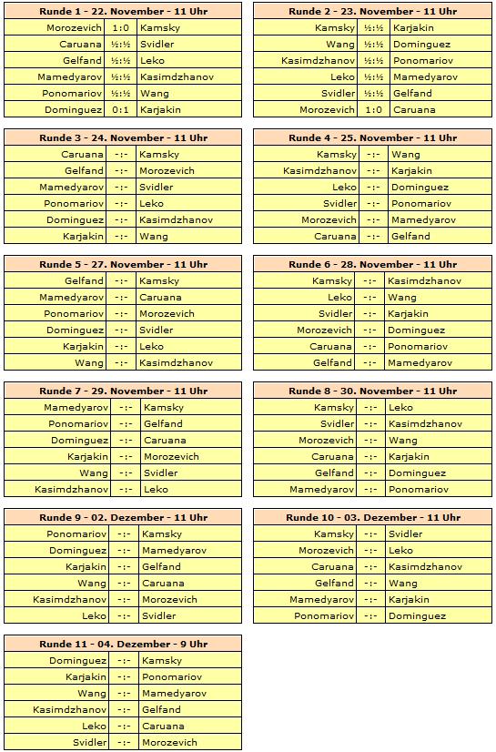 Gespielt wird ein elfrundiges Rundenturnier mit zwölf Spielern. Rundenstart ist täglich um 11:00 Uhr unserer Zeit, lediglich die letzte Runde beginnt bereits um 9:00 Uhr. Am 26. November und 01. Dezember wird jeweils ein Ruhetag eingelegt.