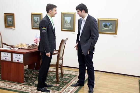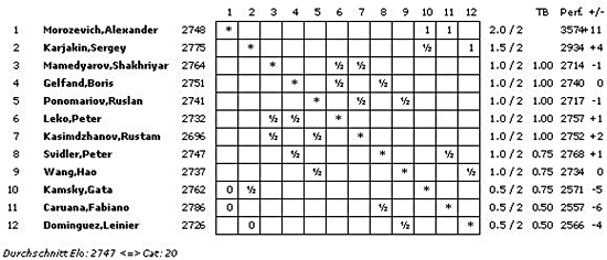 23.11.2012 - Seine zwei Weißpartien zum Auftakt des FIDE Grand Prix-Turniers in Tashkent hat Alexander Morozevich perfekt genutzt. Nach seinem gestrigen Sieg legte der Russe heute gegen Fabiano Caruana nach und gewann mit einer starken Leistung im Turmendspiel erneut. Da alle anderen Begegnungen parallel mal mehr und mal weniger spannend unentschieden endeten, führt Moro folglich alleine die Tabelle an. In der dritten Runde wird er mit Schwarz auf Vize-Weltmeister Boris Gelfand treffen. Rundenstart am Samstag ist wieder um 11 Uhr.
