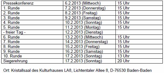 Gespielt wird vom 7. - 17. Februar 2013 in den historischen Sälen des Kulturhauses LA8 im Zentrum von Baden-Baden, in dem auch die Bundesliga-Heimspiele des deutschen Meisters stattfinden. Rundenbeginn ist täglich um 15 Uhr, am letzten Tag um 13 Uhr.
