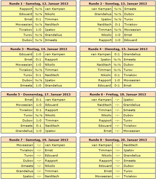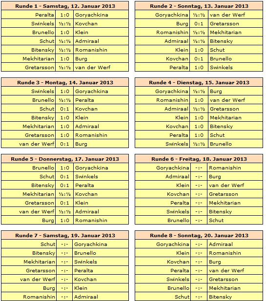 Rundenstart ist jeweils um 13:30 Uhr, lediglich die letzte Runde am 27. Januar beginnt bereits um 12:00 Uhr. Ruhetage werden am 16., 21. und 24. Januar eingelegt.